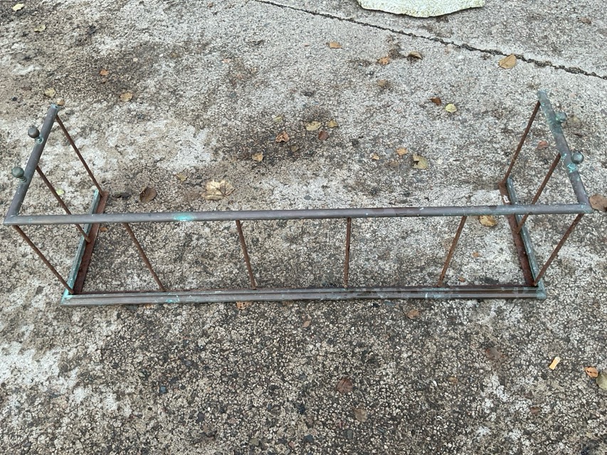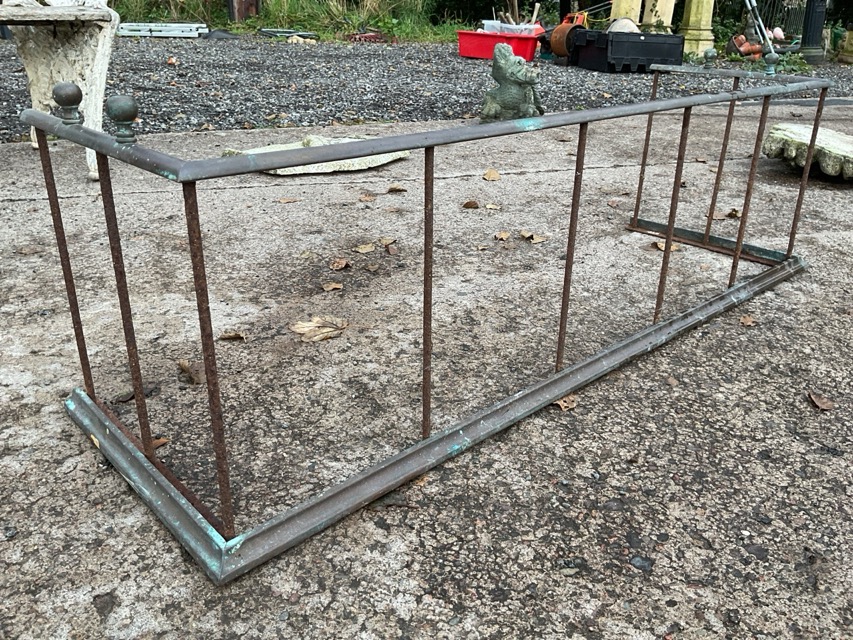 A nineteenth century copper fender with D-shaped rail on iron spindles above a moulded copper curb. (47in x 14.5in)