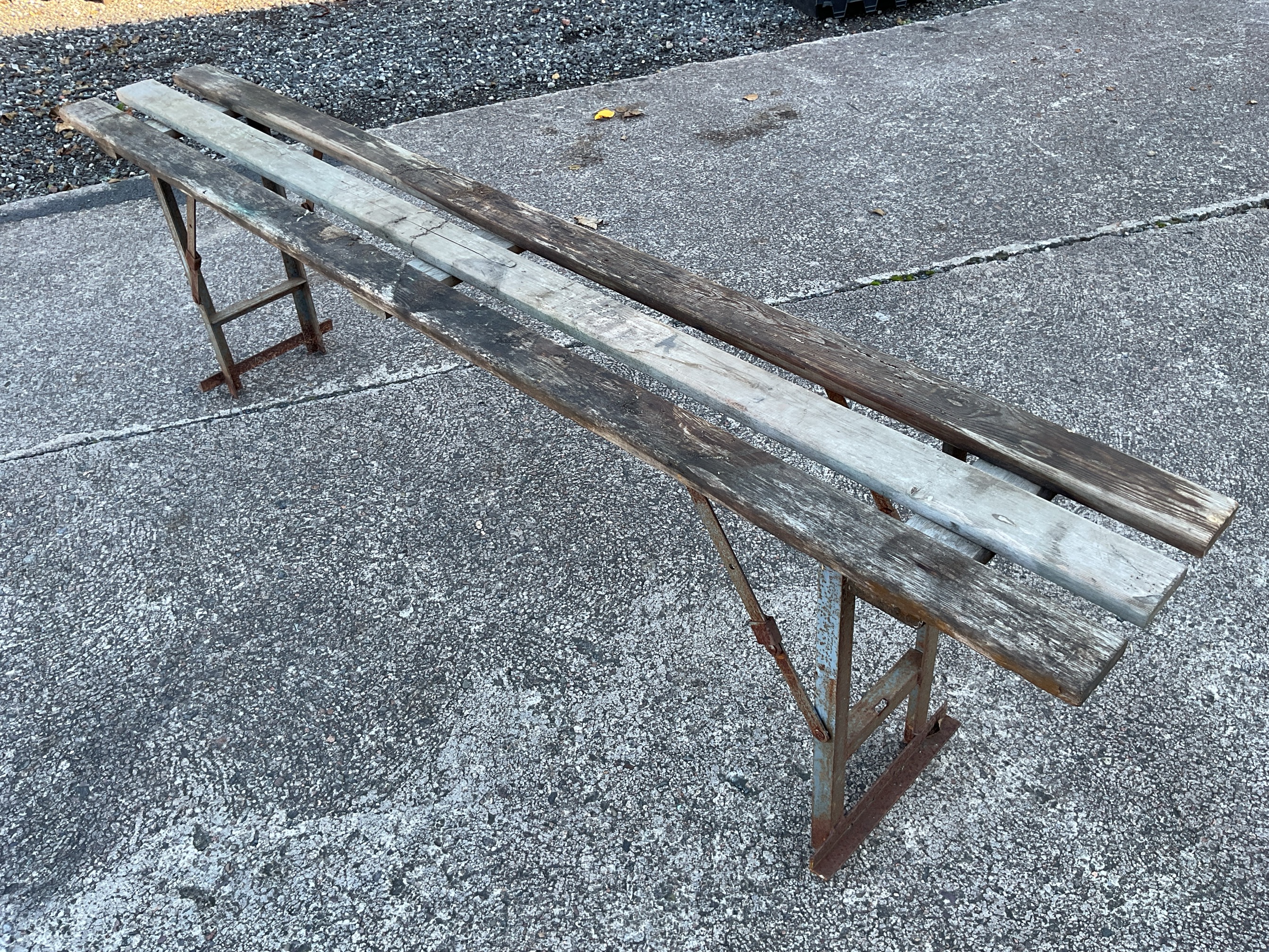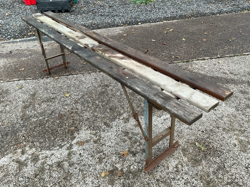A rectangular folding garden bench with three battens to seat on angleiron supports. (70.5in)