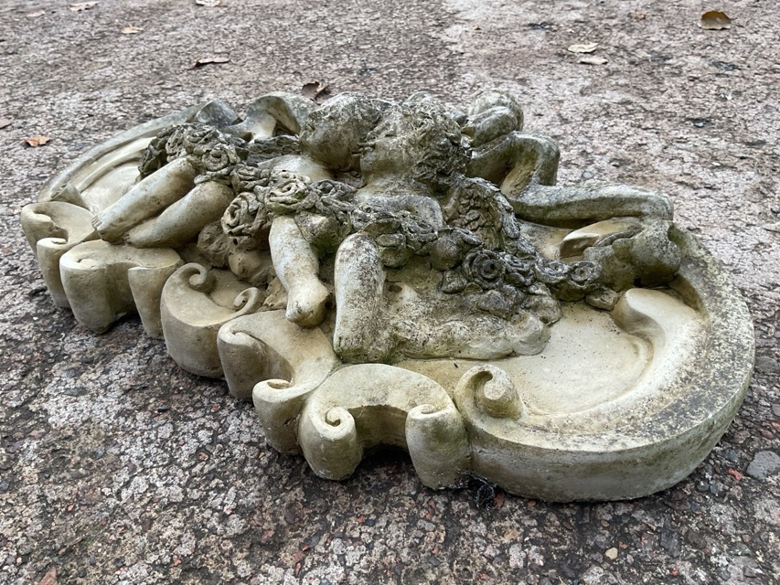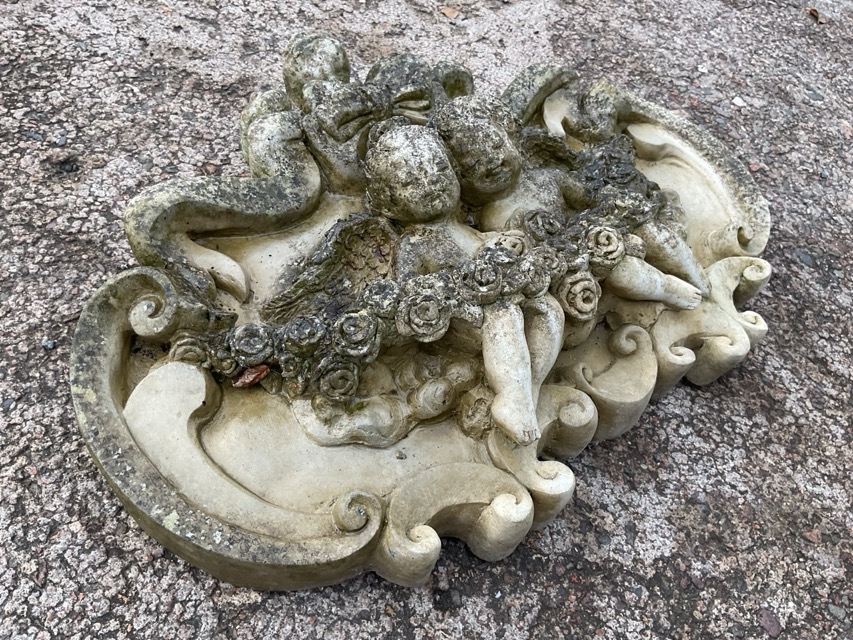 A composition stone garden wall plaque, the panel of classical scrolled form framing winged cherubs with garland beneath ribbon bow. (19in)