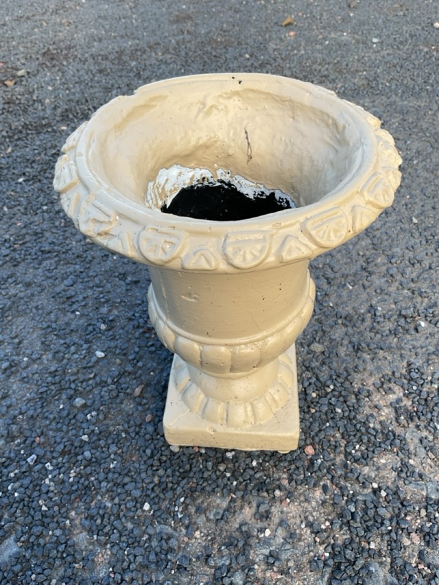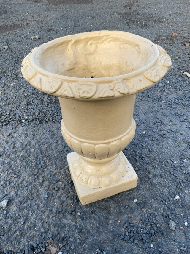 A pair of ceramic urns of traditional shape with fluted bodies on square plinths. (10in) (2)