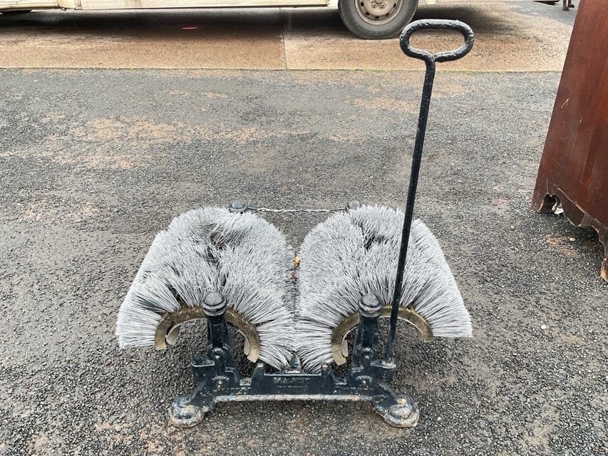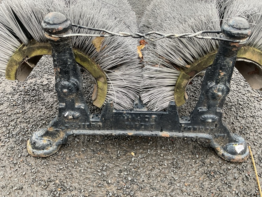 A cast iron bootscraper/ cleaner by Parmiters of Tisbury, with handle above a pair of arched brushes on flowerhead cast frame with ball finials and pad feet. (29in x 17in x 30in)