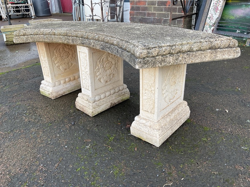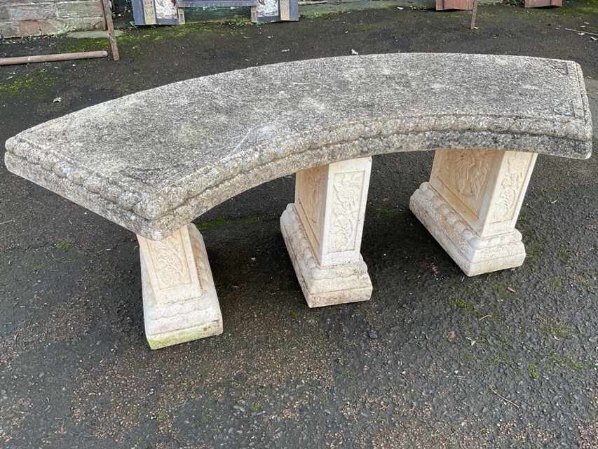 A composition stone garden bench with curved rope moulded seat raised on three rectangular flowerhead cast supports with ropetwist moulded bases. (47.5in x 17in)