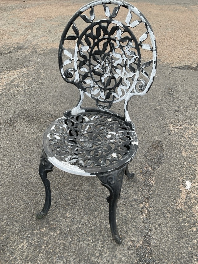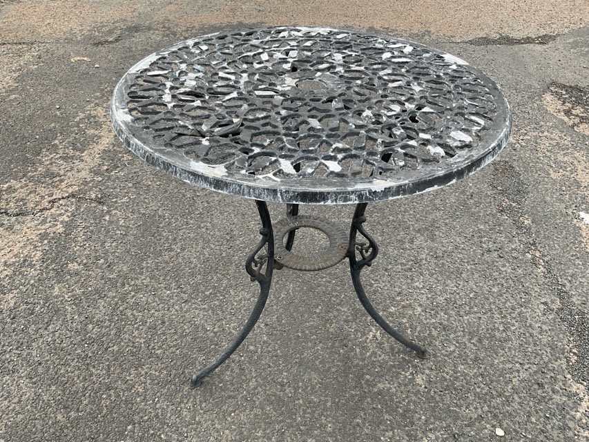 A cast metal garden table with pierced circular top on tripartite outswept legs joined by a ring stretcher, and a matching chair with pierced balloon back and circular seat raised on cabriole legs. (2)