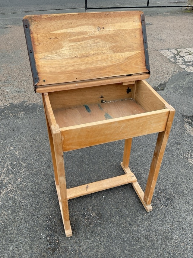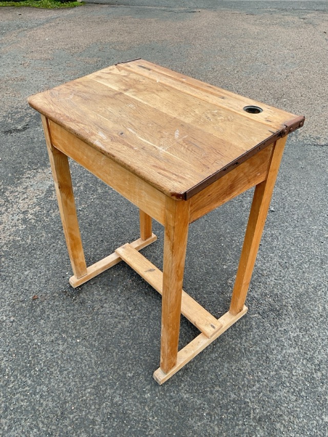A beech school desk, the rectangular top with pen tray, inkwell and hinged sloped surface raised on square legs joined by a footrest stretcher. (24in x 16in x 30.75in)