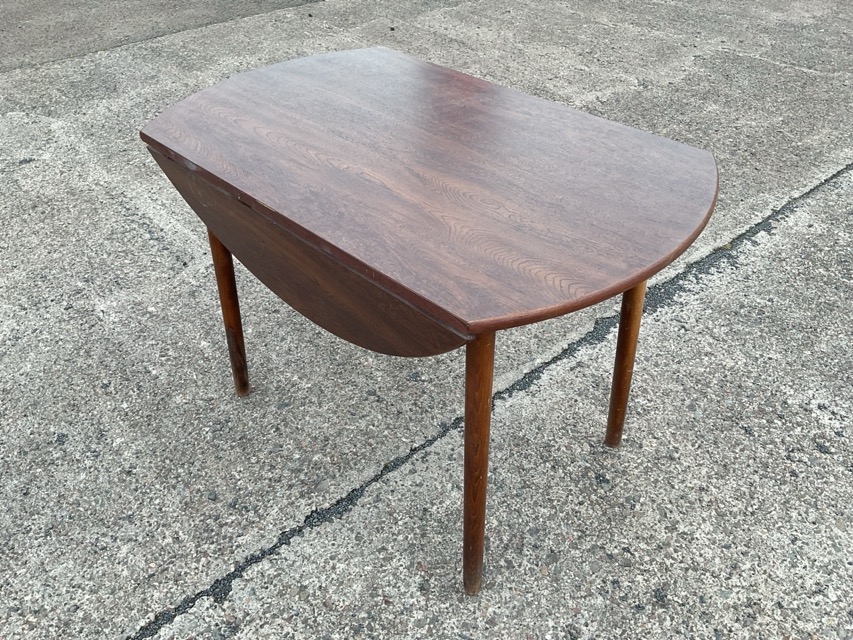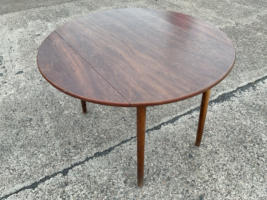 A 70s walnut effect oval dropleaf dining table with two leaves opening on lopers, raised on tapering cylindrical legs. (41.75in x 41.75in x 29in)