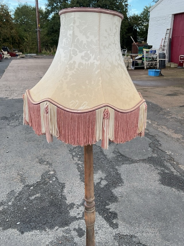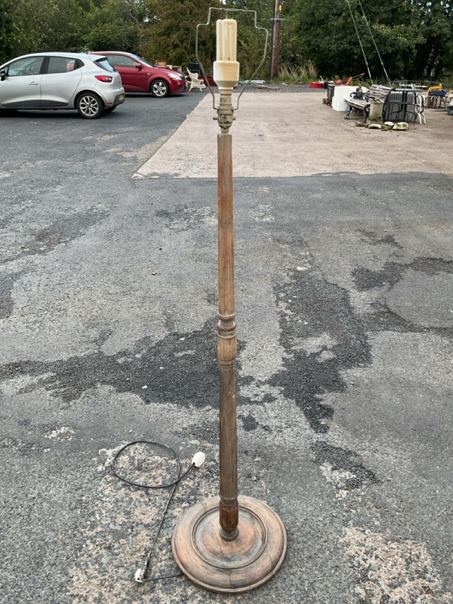 An oak standard lamp with turned column and circular base, mounted with fabric shade. (58.5in)