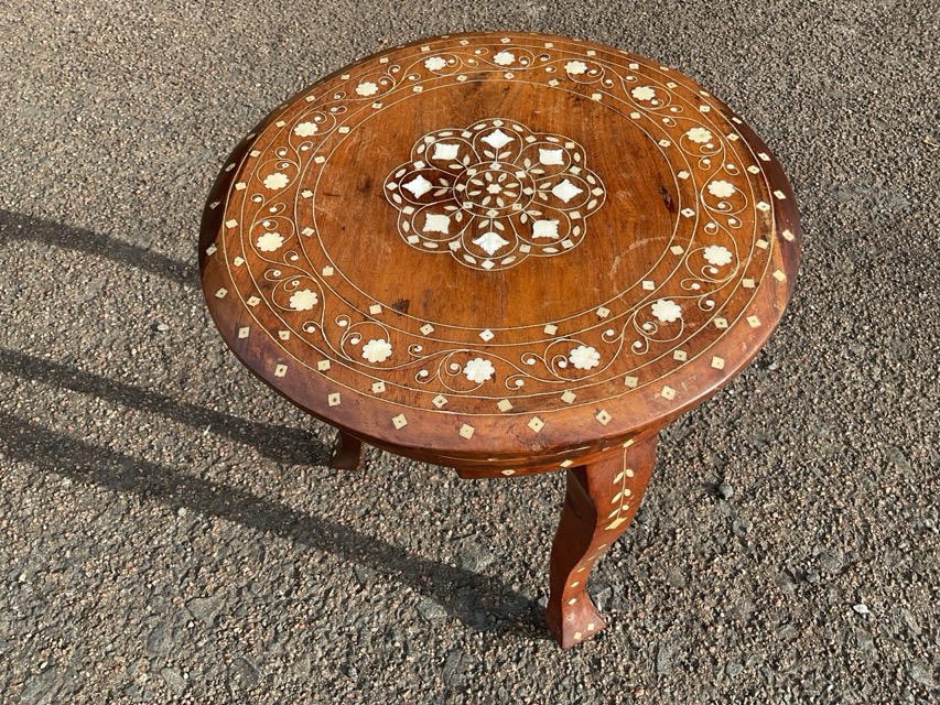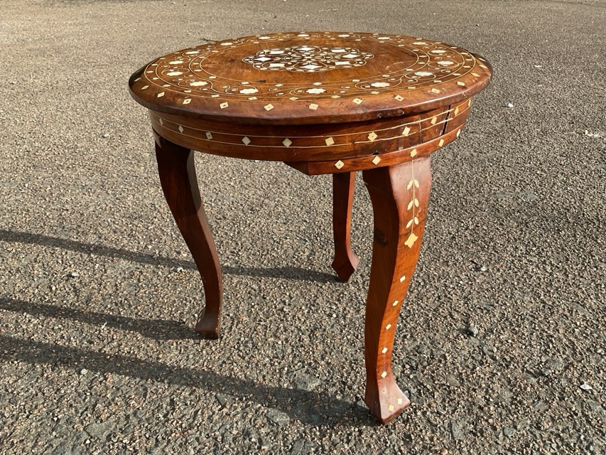 An Indian teak coffee table, the circular top raised on cabriole legs, inlaid allover in bone with a floral and lozenge motifs. (16in x 16in x 17in)