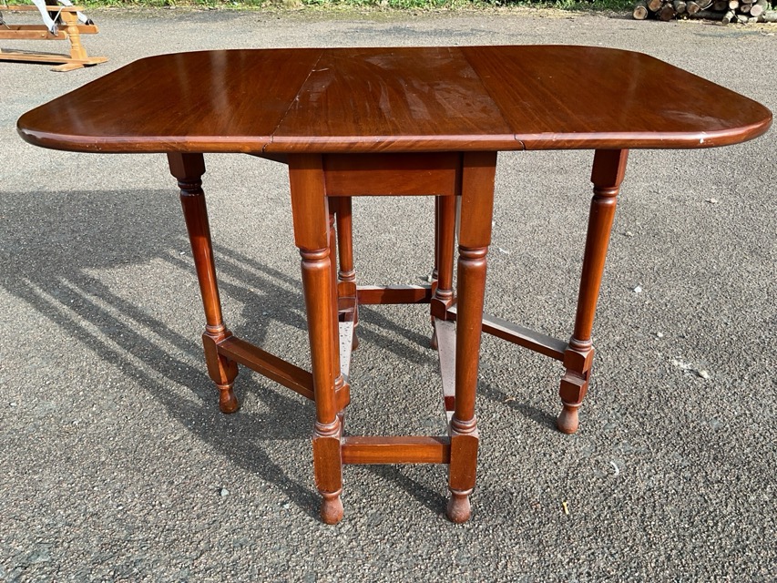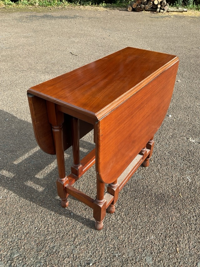 A Georgian style mahogany gateleg table with rounded rectangular top and two leaves opening on swing legs, raised on turned supports joined by stretchers. (45.75in x 30in x 28.25in)