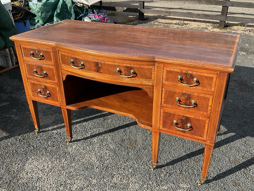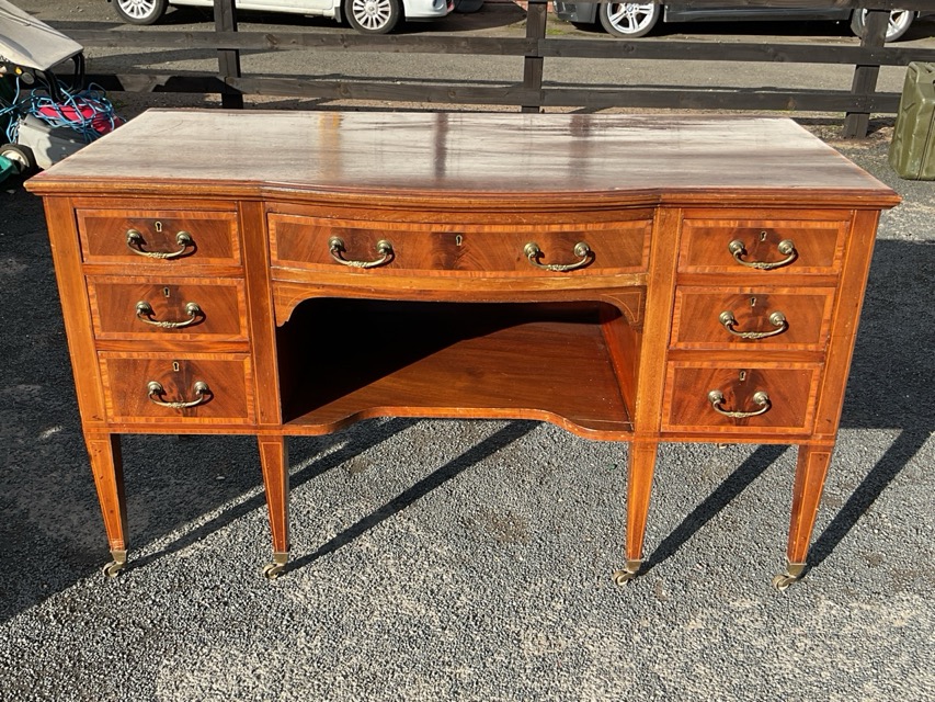 An Edwardian satinwood banded mahogany sideboard with bowfronted central section above a frieze drawer and open shelf, flanked by six further drawers, raised on tapering square legs with brass castors. (54.25in x 25.25in x 31in)