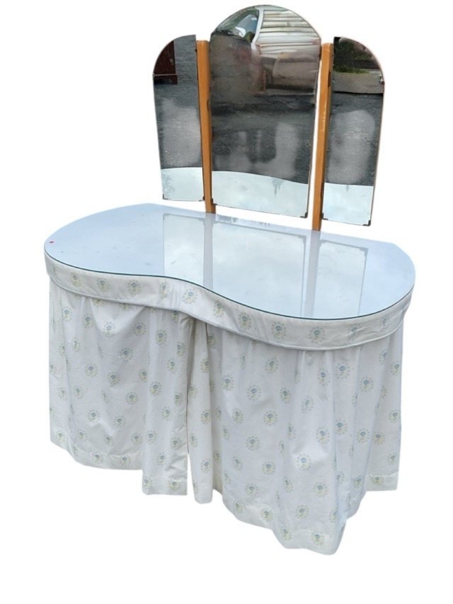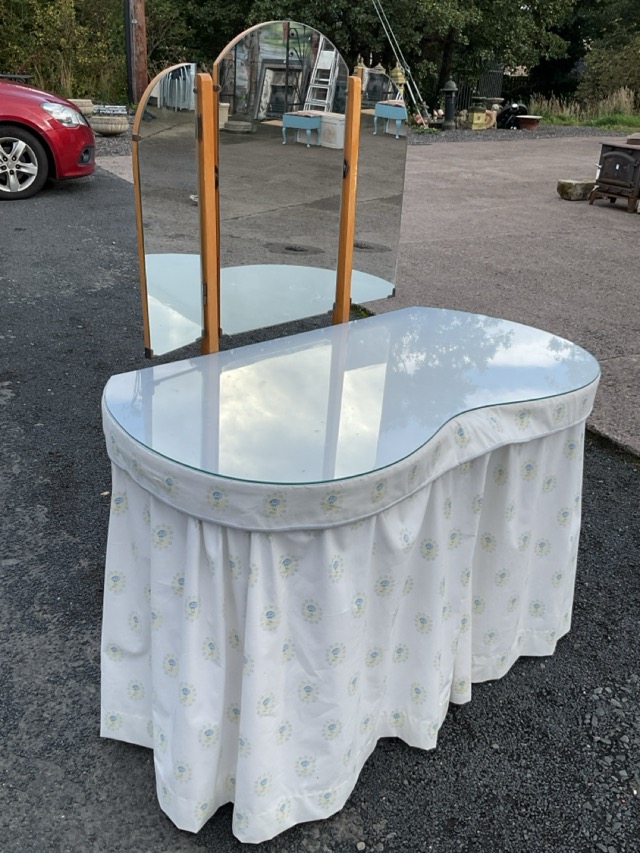 A 50s beech kidney shaped dressing table, the arched mirror with two hinged wings above a glass top and curtained base enclosing a kneehole with six knobbed drawers. (42in x 22in x 52in)