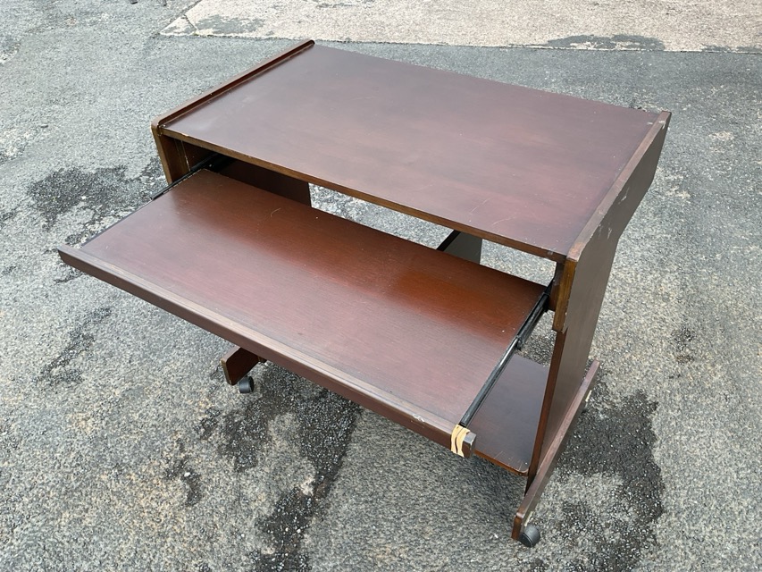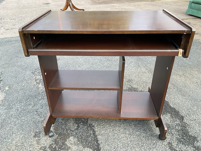 A mahogany computer desk with rectangular top above a sliding shelf and three open compartments, raised on battens with castors. (32in x 18.5in x 31.5in)