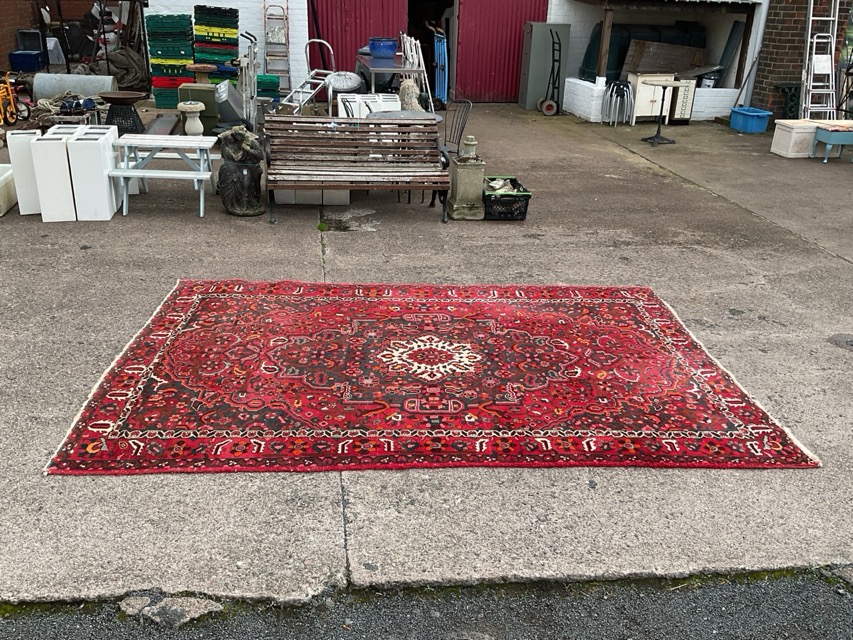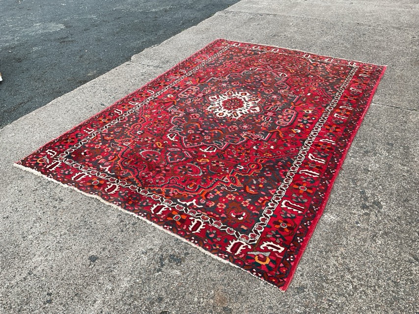 A Persian wool carpet woven with oval floral medallion on a red field amid scrolling flowers and foliage within an alternating flowerhead and boteh border. (80in x 120in)