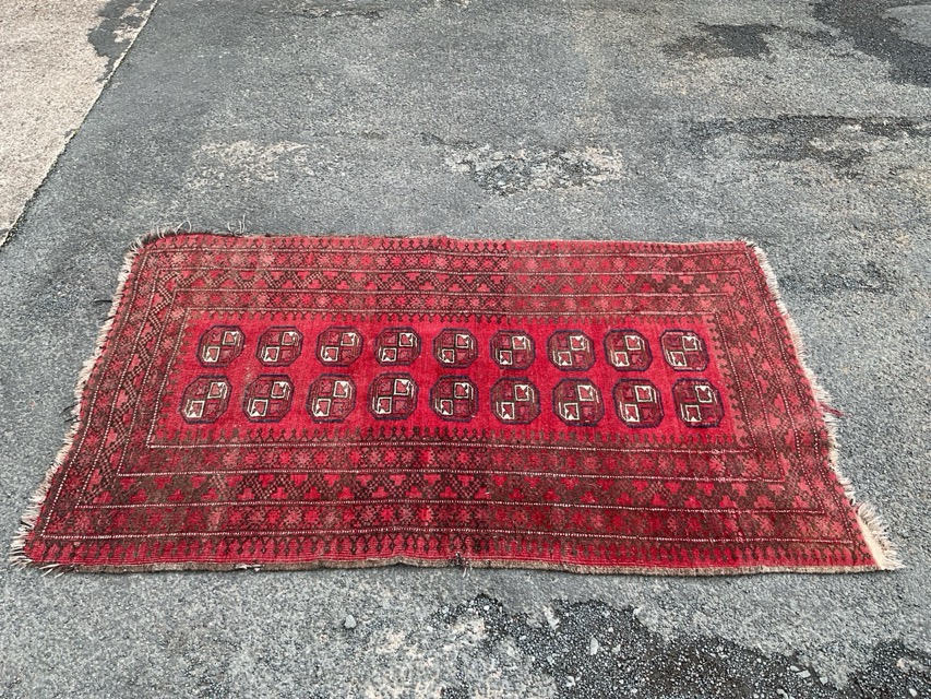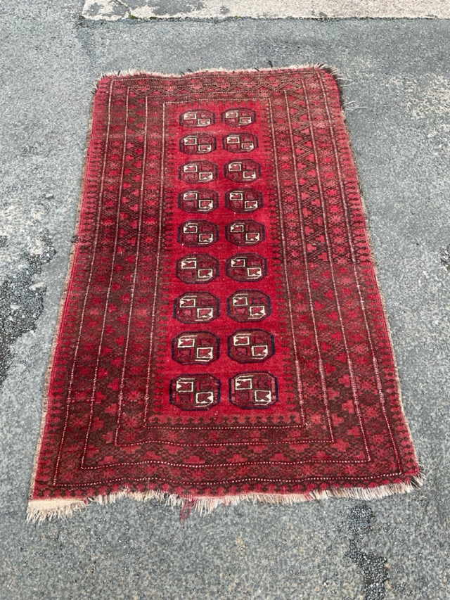 A Turkmen wool rug woven with two rows of nine gul motifs on a red field within multiple geometric borders. (42.5in x 70.5in)