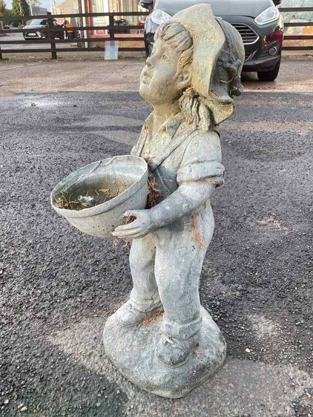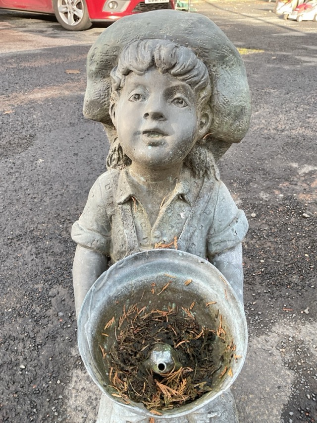 A bronze garden fountain cast as a small boy holding bowl containing the water spout. (24in)