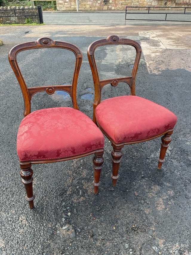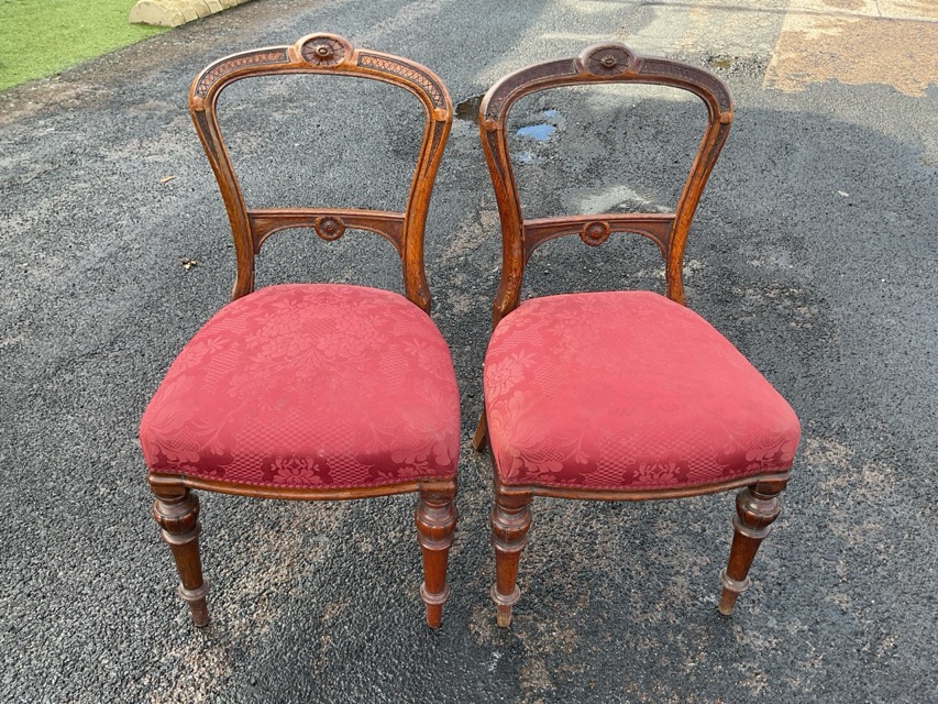A set of four Victorian walnut dining chairs with circular and oval flowerhead medallions to back rails above stuffover upholstered seats, raised on turned tapering legs. (4)