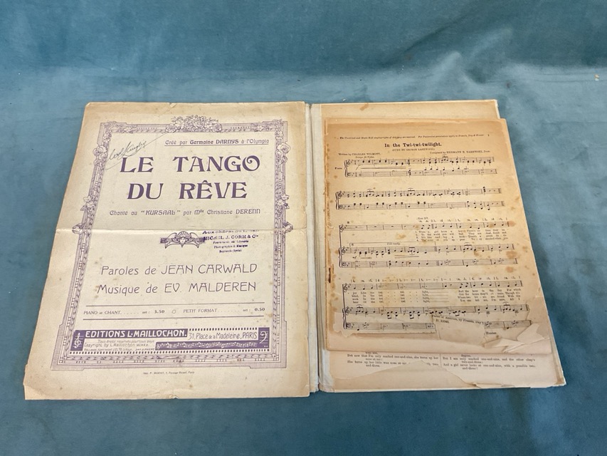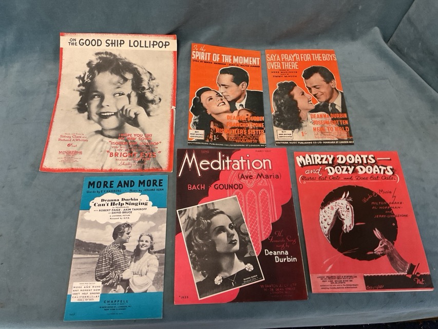 A portfolio of 20s, 30s, and 40s sheet music - a tango, music hall songs, popular songs by Shirley Temple, Deanna Durbin, etc.