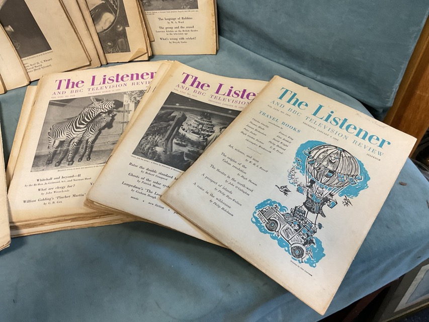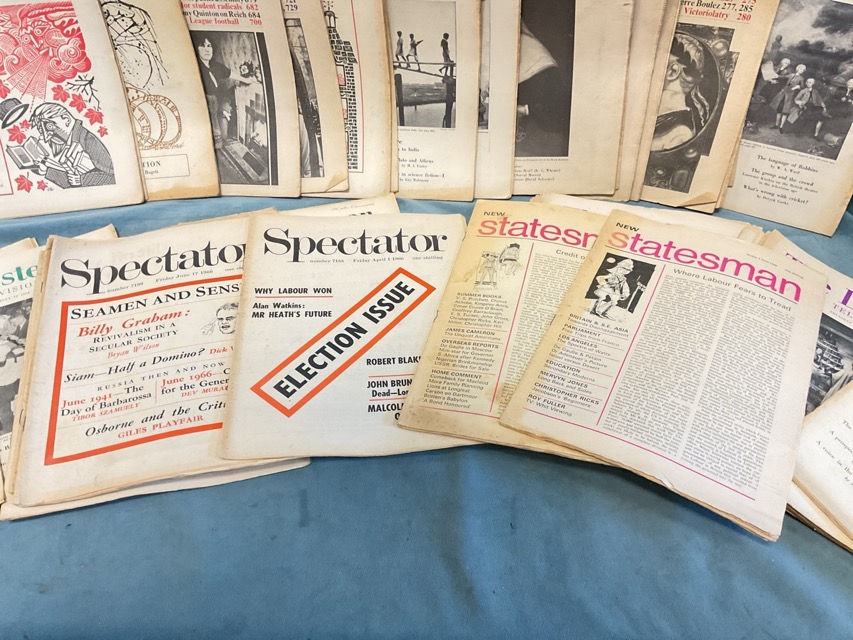 Sixty-five issues of The Listener magazine, various dates 1955-1980; two issues of the New Statesman, June 3rd & 17th 1966; and two issues of the Spectator, April 1st & June17th 1966. (69)
