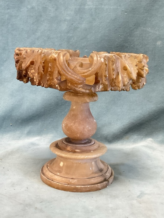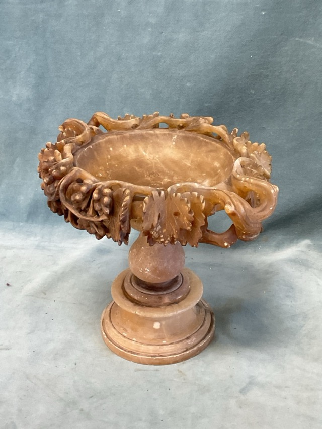 A C19th Italian alabaster tazza, the bowl carved in high relief with entwined vines on a baluster column and turned socle base. (12in x 10in x 9.5in)