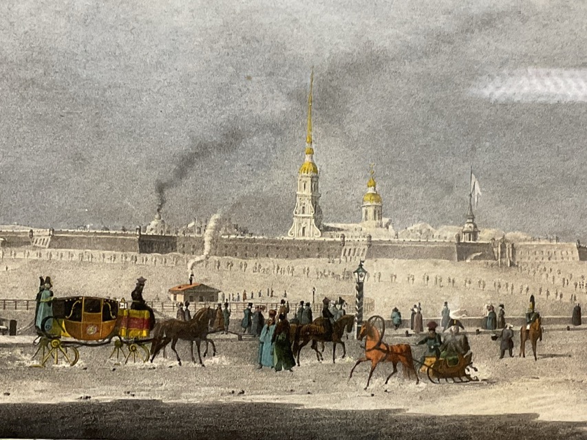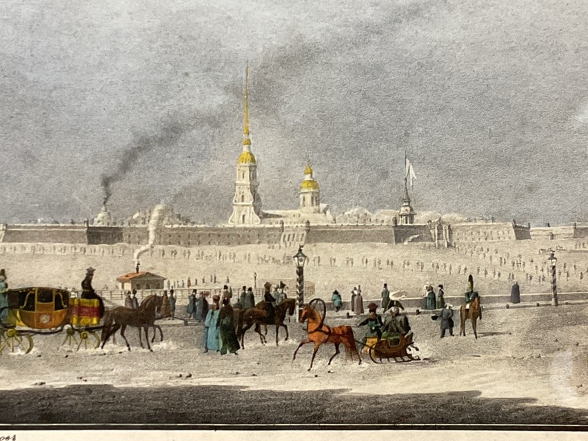 A Russian handcoloured lithograph, a view of the Peter & Paul Fortress, St Petersburg - Russia in the snow, published by H Prévost in 1833, mounted and framed. (9in x 6in)