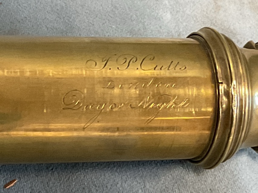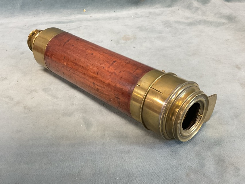 A Victorian mahogany mounted brass three-draw day & night telescope by JP Cutts of London c.1840, with integral sliding lens covers. (33in)