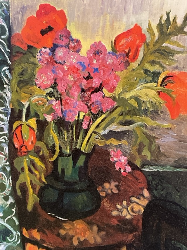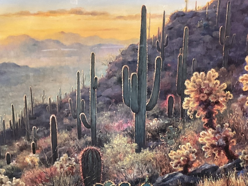 Gretchen Huber, coloured print, mountainous landscape with cacti at dusk, signed in the print, mounted and framed; and Suzanne Valadon, coloured print, oriental poppies and phlox in a jug, mounted and framed. (2)