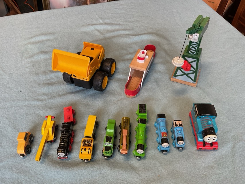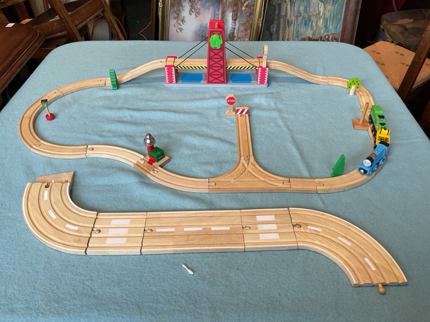 A large collection of BigJig tracks - bridges, ramps, crossings, stations, houses, rail tracks, roads, signs, trains & carriages with Thomas the Tank; and other miscellaneous toys, a Brio ferry, crane, diggers, Hot wheels, etc. (A lot)