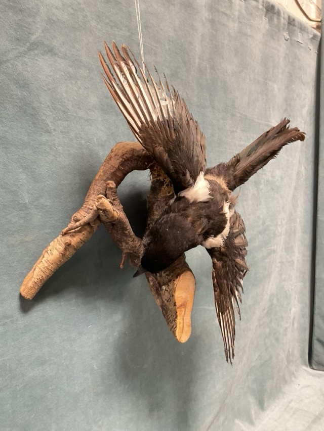 Two taxidermied magpies, one specimen wall-mounted on a birch branch with spread wings, the other perched on a hazel poston above an oval base. (2)