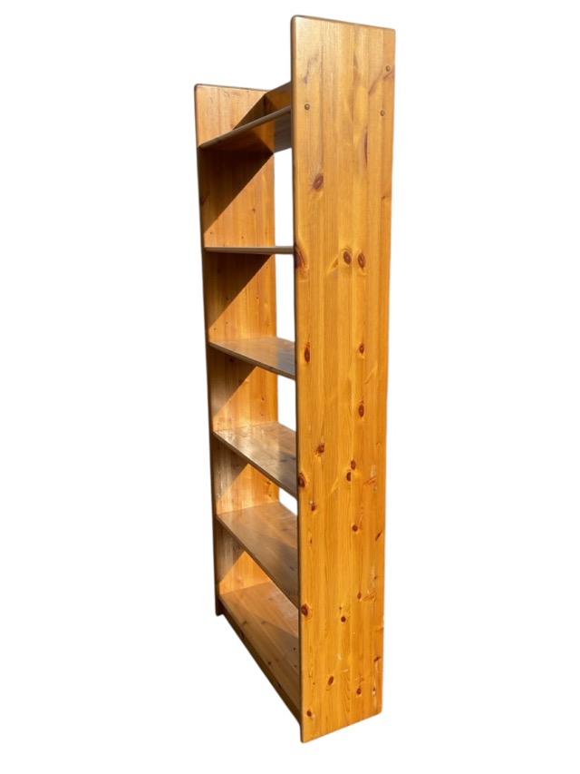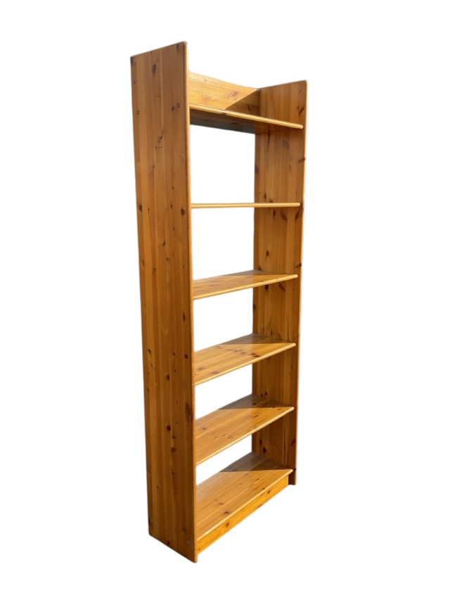 A pine open bookcase of plank construction with seven shelves, four of which adjustable, on a plinth. (31.5in x 11.75in x 81in)