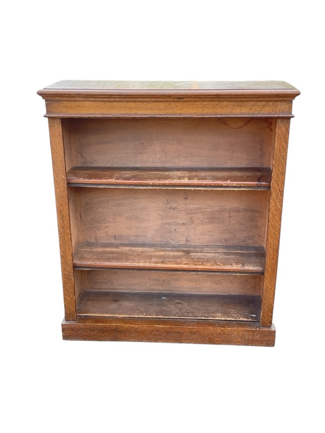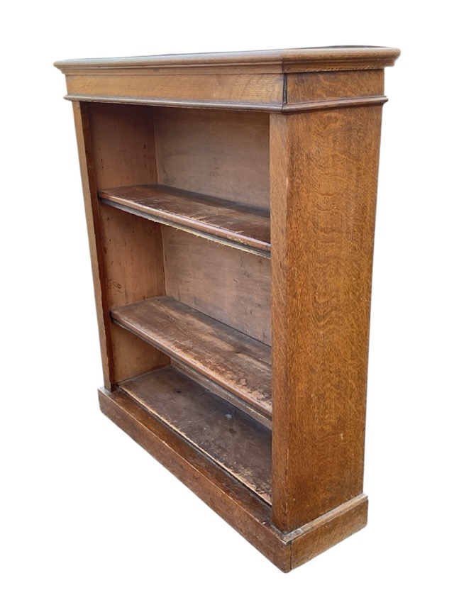 An Edwardian oak open bookcase with rectangular moulded top and cockbeaded frieze above three shelves flanked by plain pilasters on a plinth. (36in x 11in x 41.5in)