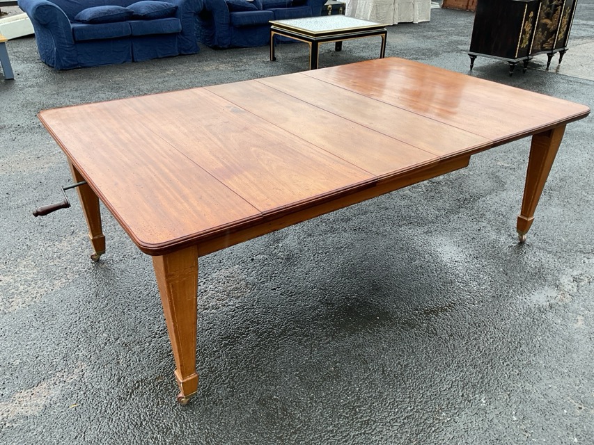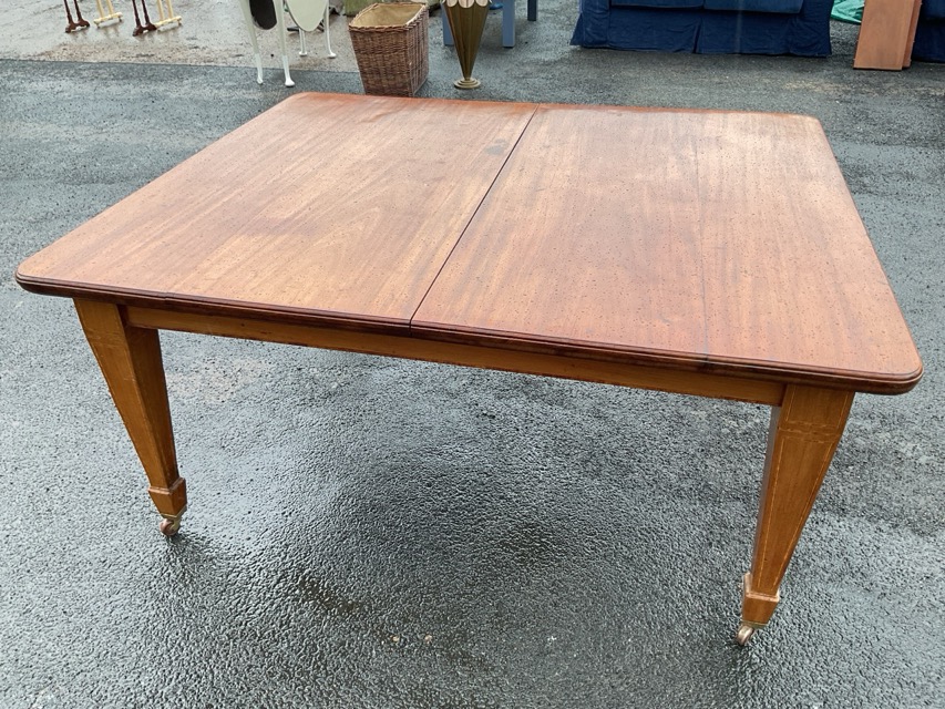 An Edwardian satinwood banded mahogany extending dining table with moulded rectangular top and two extension leaves, raised on tapering square legs with spade toes and ceramic castors. (83.5in x 50in x 29in)