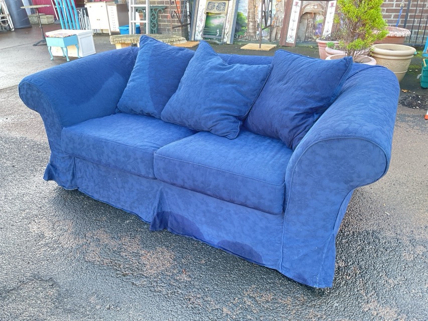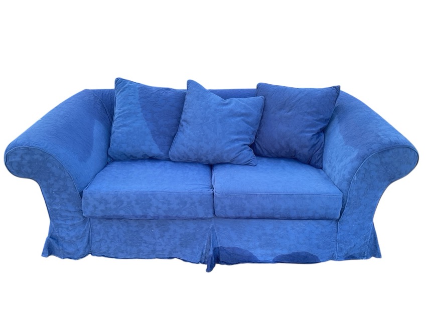 A traditional upholstered sofa with rectangular back and outscrolled arms above a rectangular seat with loose cushions and woven cotton covers, raised on cylindrical feet.