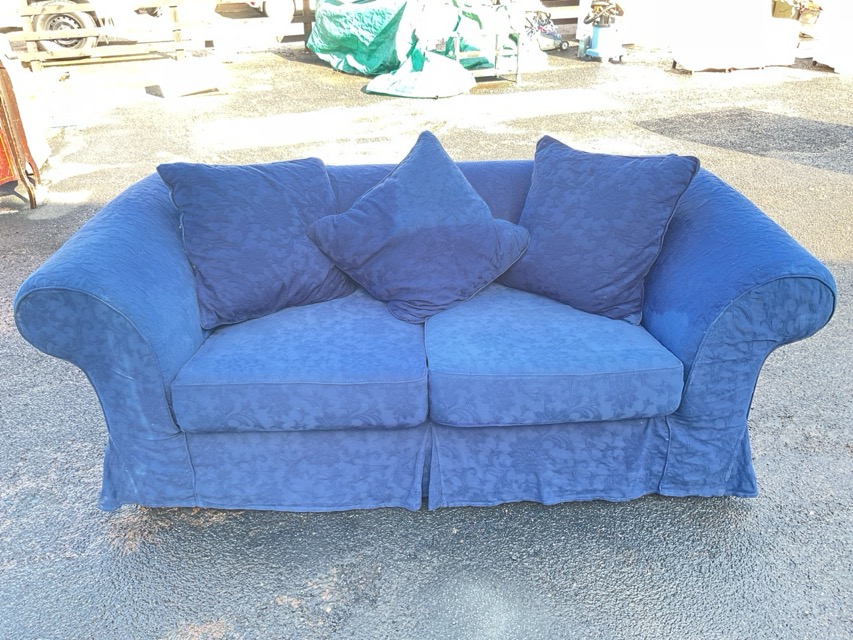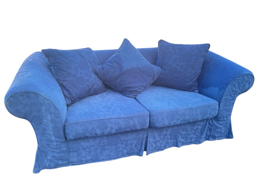 A traditional upholstered sofa with rectangular back and outscrolled arms above a rectangular seat with loose cushions and covers, raised on cylindrical feet. (80in)