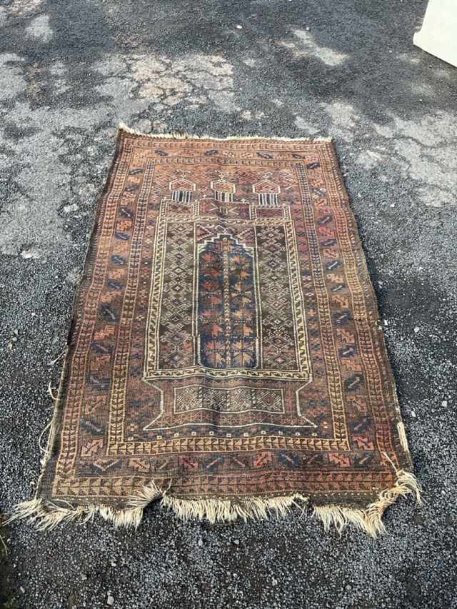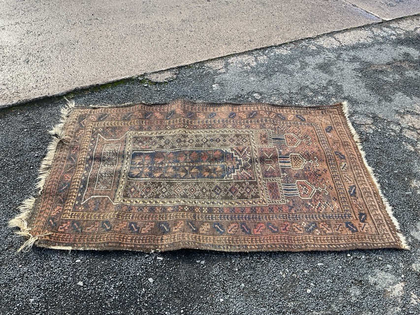 An Afghan prayer rug woven with triple domed architectural style mihrab on a brick red field with flowerhead motifs, within multiple geometric and stylised foliate leaf borders. (39.5in x 68in)