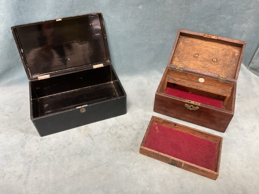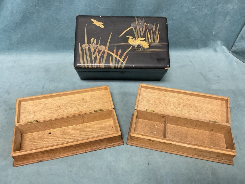 A Georgian mahogany box with internal tray having brass escutcheon and handle; a pair of rectangular oak boxes on plinths; and a Japanese lacquered box with cover decorated with gilt birds & lilies. (4)