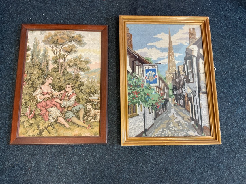 A woolwork tapestry panel depicting pub in narrow street overlooked by church, in gilt frame; and a tapestry of courting couple in bucolic landscape, framed. (2)
