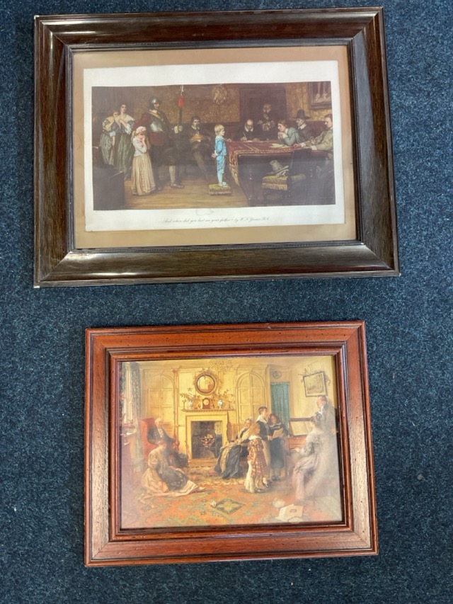 W.F Yeames, coloured print, When Did You Last See Your Father, mounted and framed; and a coloured print, depicting Victorian family in the parlour, framed. (2)