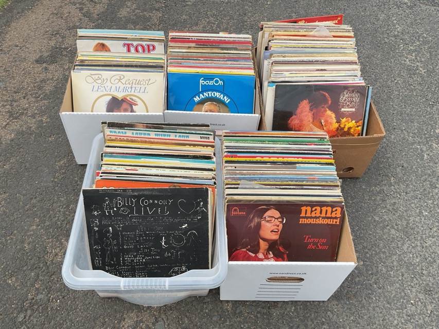 A collection of vinyl records from 50s to 80s - pop, easy listening, classical, Scottish, folk, Cat Stevens, Tom Jones, comedy sets, Billy Connolly, Nana Mouskouri, Jim Reeves, country, Shirley Bassey, jazz, Don Williams, childrens stories, Jasper Carrot, etc. (approx 361)