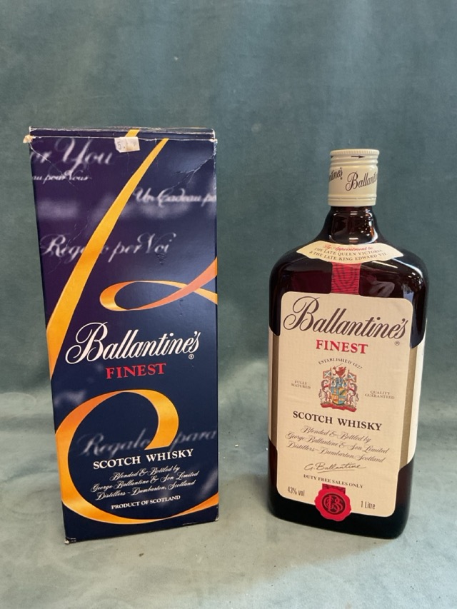 A boxed litre bottle of Ballantines scotch whisky, the 43% spirit bottled in Dumbarton for the duty free market. (10in)
