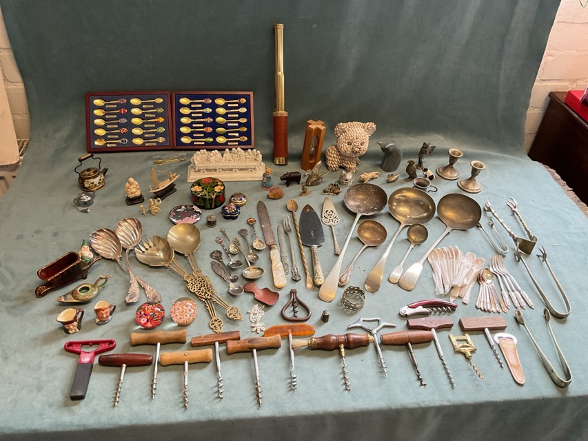 Miscellaneous collectors items - a 1914 hallmarked thimble, miniature, ceramic, bone, silver plate, animals, corkscrews, a telescope, pill boxes, Royal Doulton character jugs, coffee spoons, ladles, salad servers, etc. (A lot)