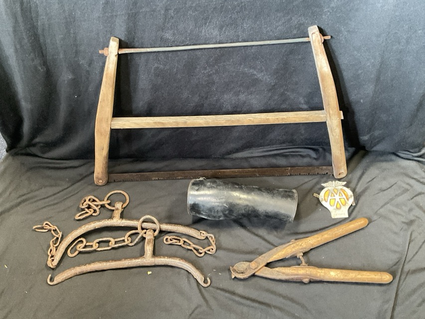 Miscellaneous items - an antique saw, wood handled blacksmiths shears, a leather gaiter, a pair of haines, and an AA car badge. (5)