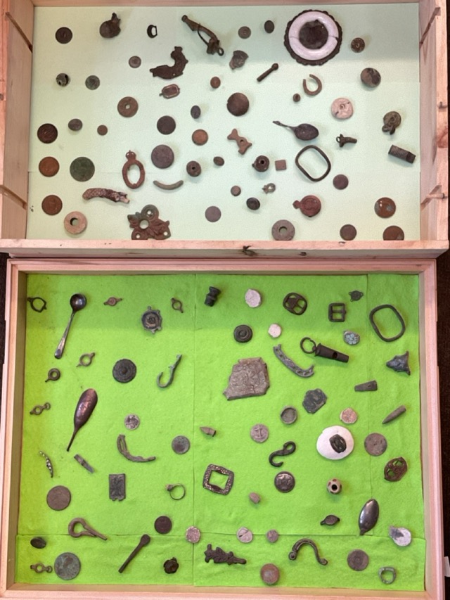 A collection of metal detector archeological “finds” - a late medieval ring, Roman brooches, coins, bullets, buckles, a Georgian intaglio ring, old spoons, belt fastenings, watch keys, fragments, buttons, badges, medallions, etc. (124 pieces)
