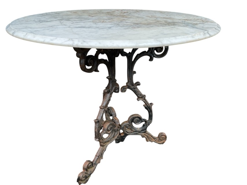 A circular marble topped garden table with moulded rim, supported on cast iron base with scrolled decoration. (35.25in x 28.25in)