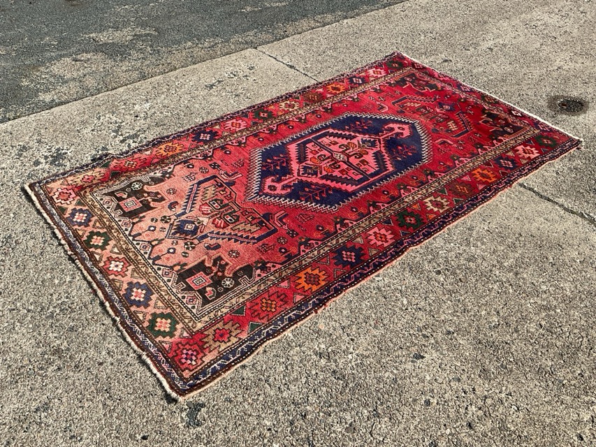 A Hamadan wool rug woven with hexagonal medallion on a red field with scattered stylised flowers, within a flowerhead border. (51in x 93.5in)