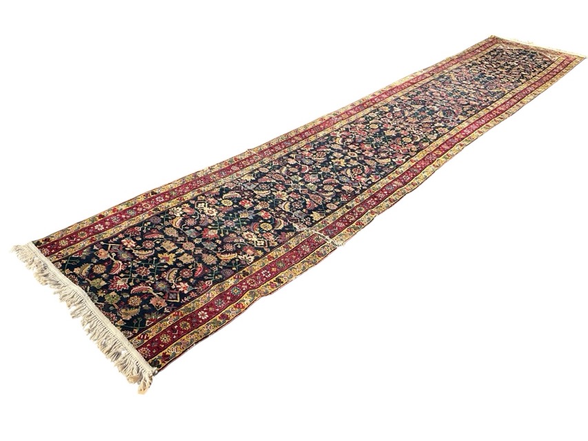 A Tabriz wool runner woven with symmetrical scrolled flowers and foliage on a dark blue field, within meandering flowering vine and flowerhead borders. (41.25in x 209in)