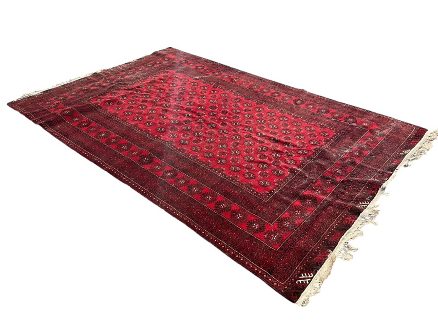 A Turkmen wool carpet woven with six rows of circular gul motifs on a red field within geometric floral borders. (77.5in x 117in)
