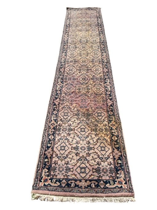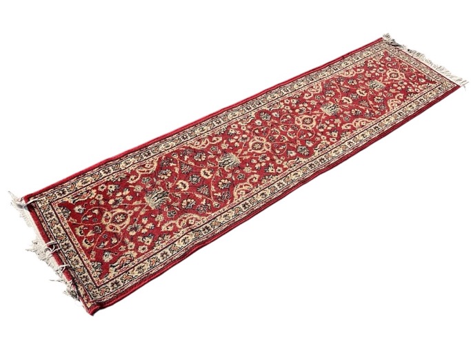 A Persian style wool runner woven with scrolled floral motifs on a red field, within flowerhead and foliate borders. (24in x 92.5in)