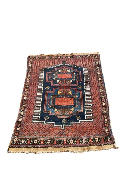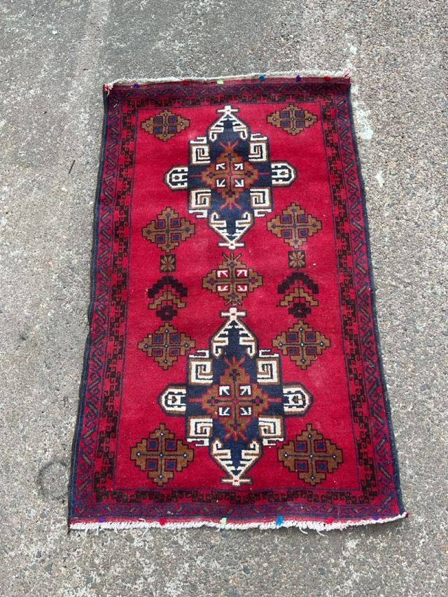 A Baluchi wool rug woven with two geometric medallions amid cruciform and floral motifs on red ground, within scrolling meandering borders. (53in x 31.5in)