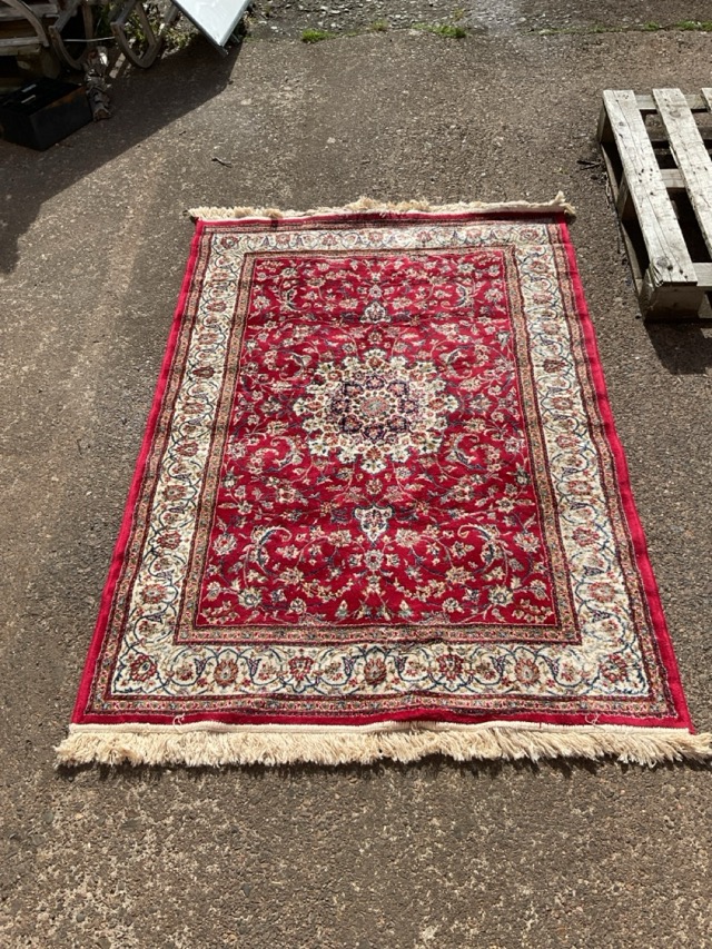 A Kashmir style rug woven rug with floral medallion amid scrolling foliage and blossoms on a red field, within a flowering vine border. (65in x 45in)