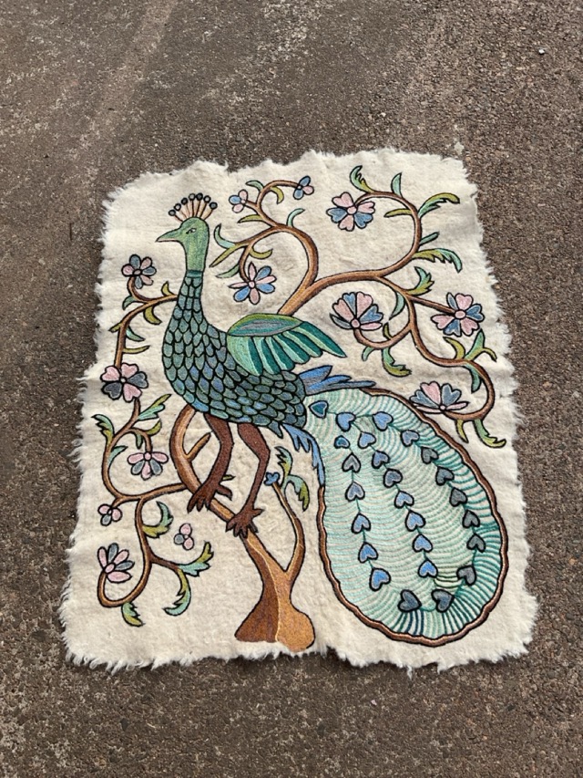 A Kashmiri wool felt rug or wall hanging embroidered in chain stitch with a peacock in a blossoming tree. (46in x 36in)