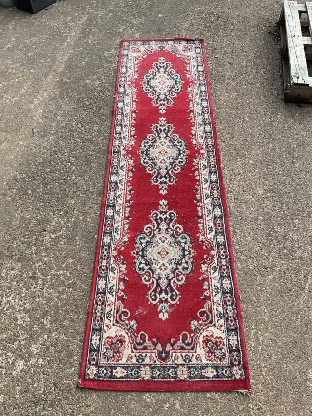 A Persian style runner woven with three elliptical scrolled medallions on a brick red field, within flowerhead borders. (90in x 24in)